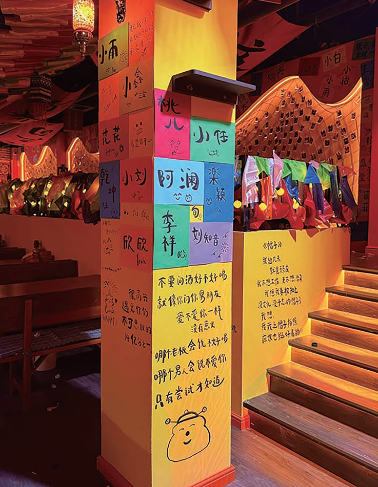 橘色与黄色为主色调的装修风格,融合现代社交属性与民谣藏风元素,营造出温暖而热情的“家”的氛围。墙上的照片和心愿卡记录了无数美好时刻,让顾客在这里找到归属感与共鸣。王梓煦深知,在当代年轻人的生活中,一个能卸下伪装、真诚交流的空间比酒水本身更为珍贵。三旬酒馆通过“标签系统”记录每位顾客的喜好——爱点的歌、常喝的酒、他们的故事,甚至他们在店里的特殊记忆。这种极致的个性化服务,让90%的顾客都成为了回头客,形成了强大的情感粘性。