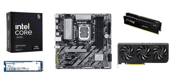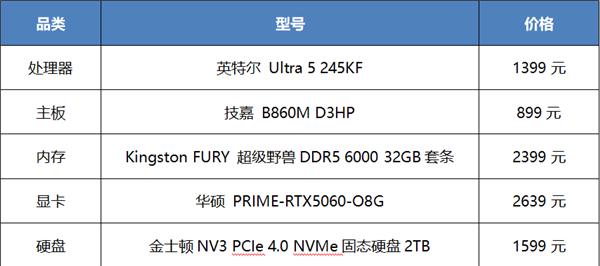 英特尔酷睿Ultra5 245KF处理器6大核8小核14线程,大核频率4.2-5.4GHz,小核频率3.6-4.6GHz,二级缓存26MB,三级缓存24MB,基准功耗只有125W,加速功耗159W。主板选择了技嘉 B860M D3HP,采用4+1+2供电模组,4条内存插槽,最高可支持256GB的DDR5 内存,并提供了2组PCIe 4.0 M.2接口。